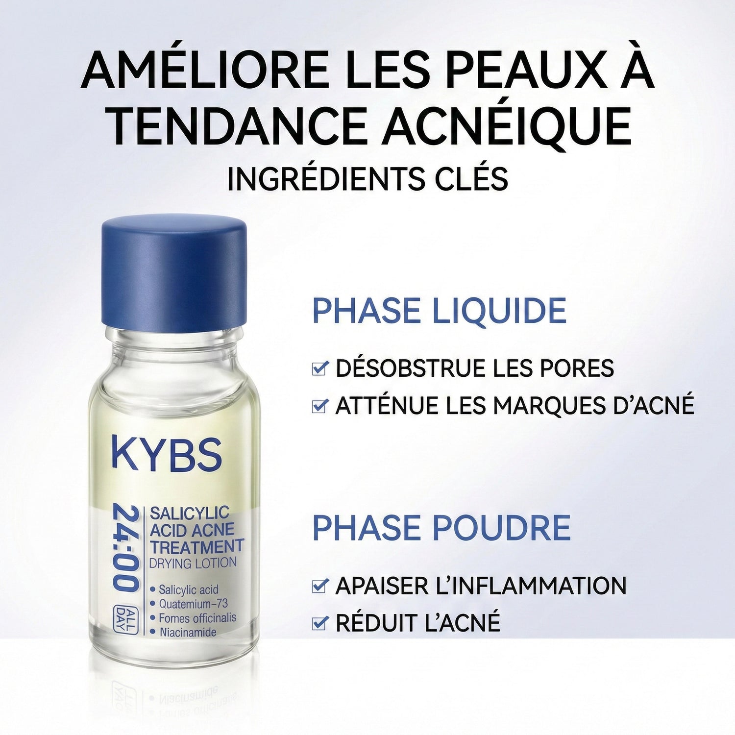 Nous avons créé KYBS, un soin ciblé à l’acide salicylique 1,8% pour réduire rapidement les boutons, apaiser l’inflammation et atténuer les marques post-acné, sans agresser la peau.